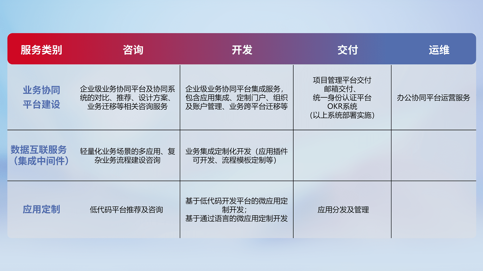 针对钉钉、、、、企微、、、IDaas等平台级产品提供产品的规划、、方案、、、交付、、、定制化开发等服务,,,,实现如统一协同办公、、智能客户服务、、、、混合会议管理、、智能数据查询、、等业务场景,,,实现数字化转型。。