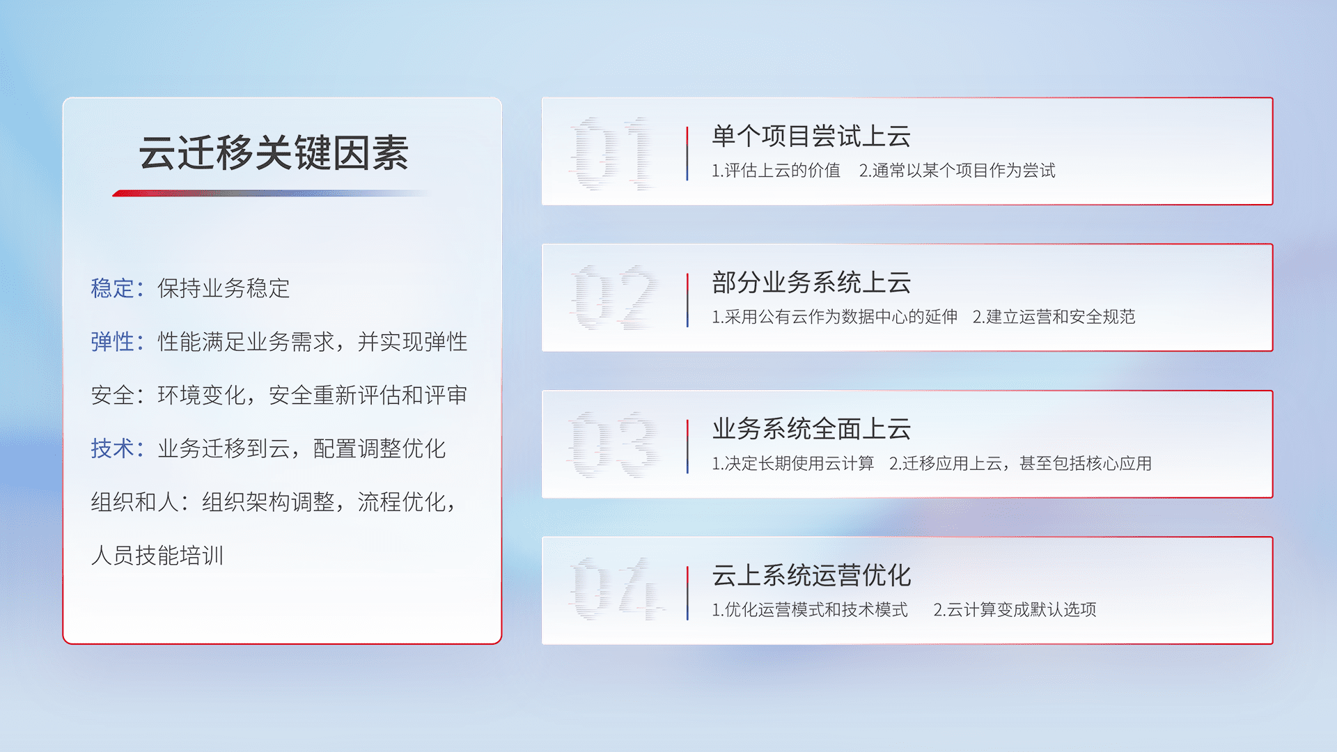 结合实际业务,,从规划设计、、、、云平台选型、、云原生改造、、、数据迁移、、集成交付,,,,迁移全过程为客户识别最佳上云路径,,,做好风险识别管理,,,设计网络架构、、身份权限、、、安全审计合规、、操作审计、、、、日志审计、、、、监控告警策略、、多站点容灾设计等,,,对云上基础设施进行整体规划,,,提升IT治理水平,,以满足弹性、、、高可用、、、高性能的需求。。。。